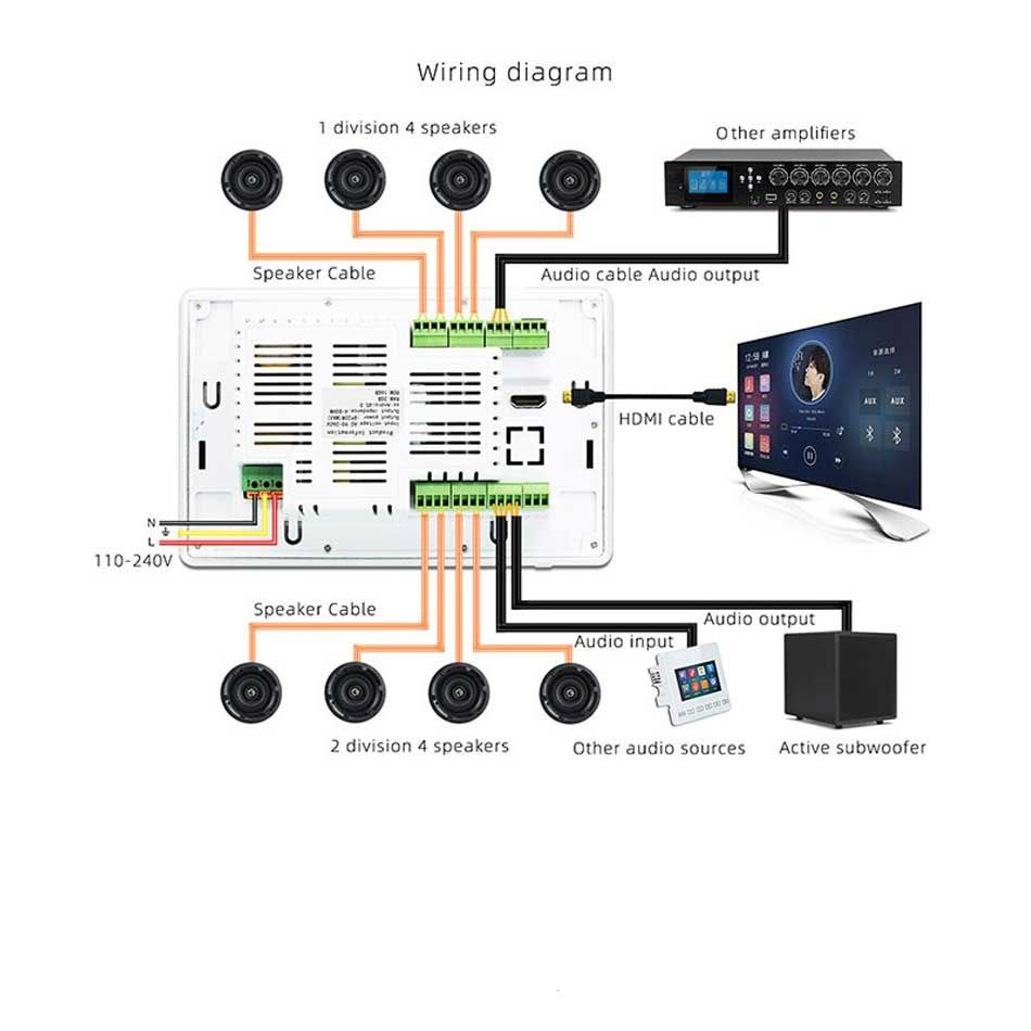- طراحی توکار و مینیمال: طراحی این آمپلی فایر به گونهای است که به صورت کامل در دیوار نصب میشود و به دلیل ظاهر ساده و شیک خود، به زیبایی محیط میافزاید.