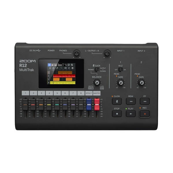 رکوردر مولتی ترک زوم ZOOM مدل R12 یک رکوردر مولتی ترک جمعوجور و همهکاره است. این دستگاه به شما امکان میدهد ایدههای موسیقی خود را سریع ثبت کنید یا آهنگهای کامل را ضبط و میکس کنید. قابلیت ضبط همزمان 2 ترک و پخش 8 ترک را دارد. یک صفحه نمایش لمسی رنگی 2.4 اینچی، ناوبری و ویرایش را بصری میکند.