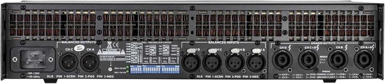 - کنترلها: کنترل گین (ولوم) مستقل برای هر ۴ کانال، سوئیچ انتخاب حالت کاری (Stereo, Parallel, Bridge)